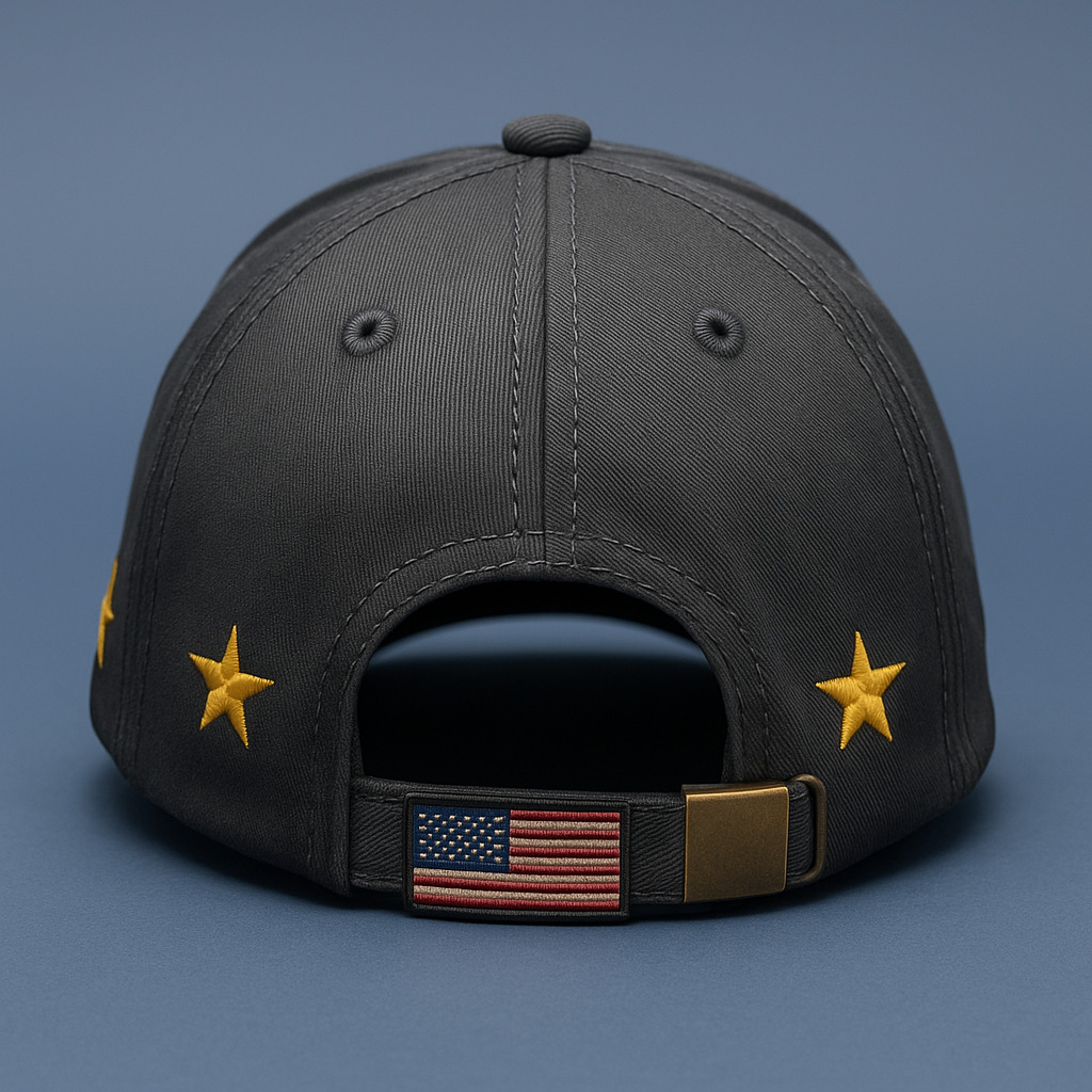 Adjustable strapback with U.S. flag patch and durable brass buckle closure